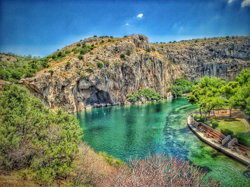 Lake Vouliagmeni breaks the journey in the most pleasant way possible. The lake was formed thousands of years ago when the roof of a vast underground cavern collapsed, creating an enclosed lagoon fed by thermal springs from Mount Hymettus and the tidal waters of the sea. The water maintains a constant temperature between 22 and 29°C year-round and carries a mineral composition rich in calcium, iron, and potassium — warm enough to swim in January, and classified as part of Greece's NATURA 2000 protected wetland network.