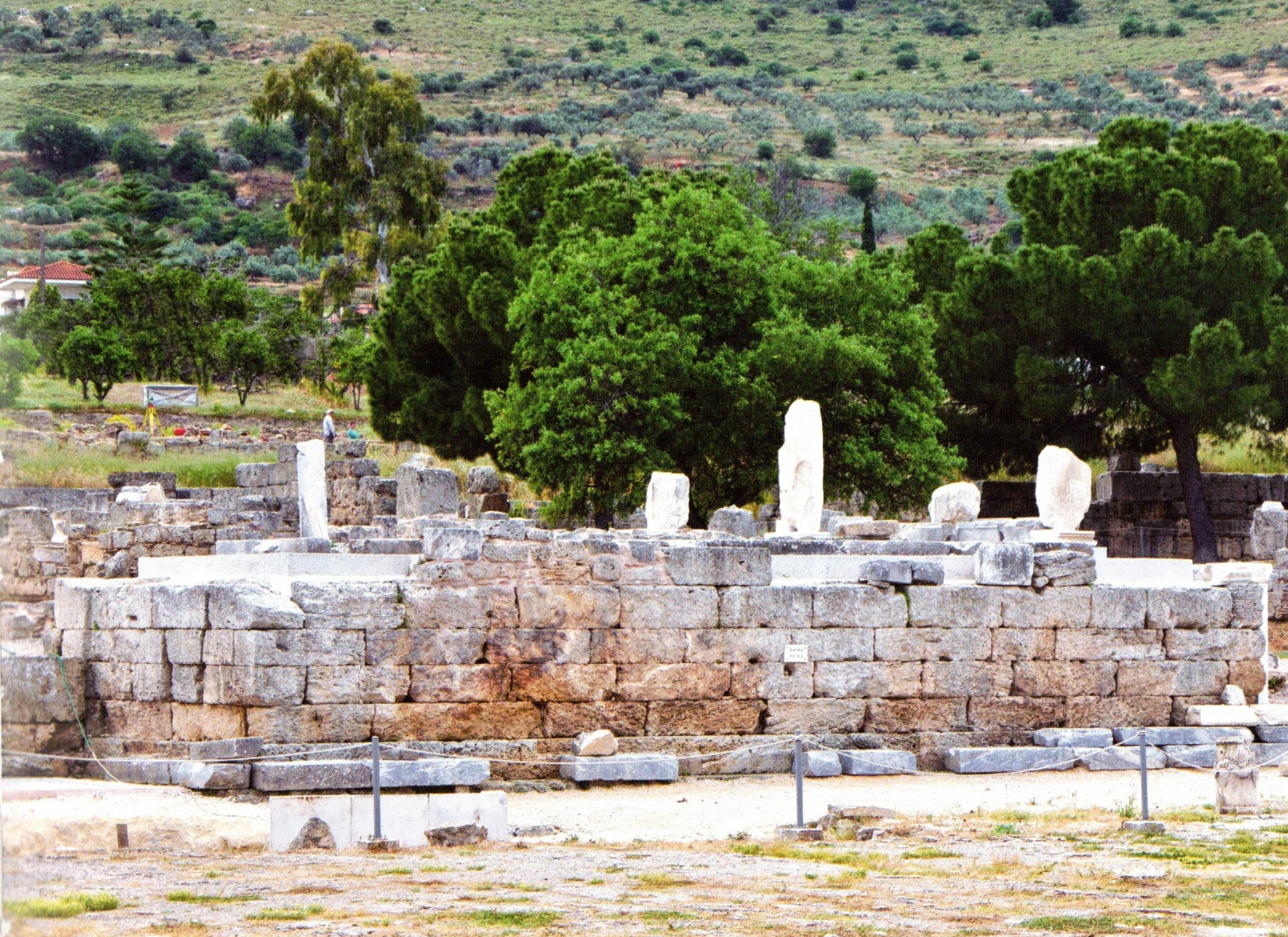 At the archaeological site, the Temple of Apollo — built in the 6th century BC with seven original Doric columns still standing — dominates the view. Walking the ancient agora below it, you pass Glauke's Well (tied to the myth of Jason and Medea), Roman temples and baths, and arrive at the Bema — the raised stone platform where Paul stood trial before the Roman proconsul Gallio in 52 AD, as described in Acts 18.