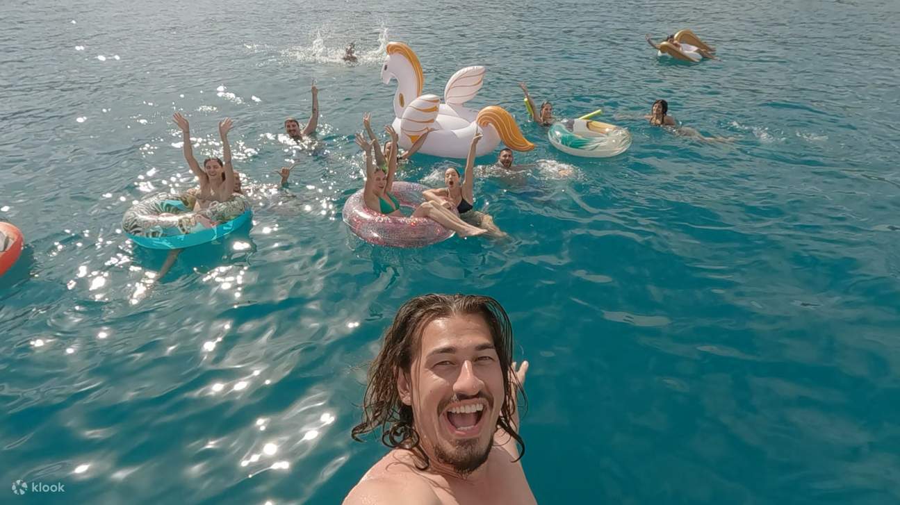 The Athens swimming cruise is a full day on the water — four stops in the Saronic Gulf, each one different from the last, connected by the kind of blue water that makes every photograph look like it was edited. This is not a sightseeing cruise. It is a swimming cruise, built around getting into the sea at places most visitors to Athens never reach. Departing in the morning and returning along the Athenian Riviera at sunset, with a Mediterranean lunch buffet, unlimited drinks, and a live DJ onboard, the day takes care of itself from the moment you step aboard.
